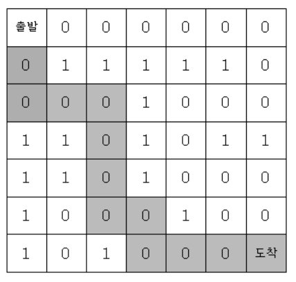 ์ถ๋ฐ์ ์ ๊ฒฉ์์ (0, 0) ์ขํ์ด๊ณ , ํ์ถ ๋์ฐฉ์ ์ (6, 6)์ขํ์ด๋ค. ๊ฒฉ์ํ์ 1์ ๋ฒฝ์ด๊ณ , 0์ ๋๋ก์ด๋ค.