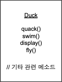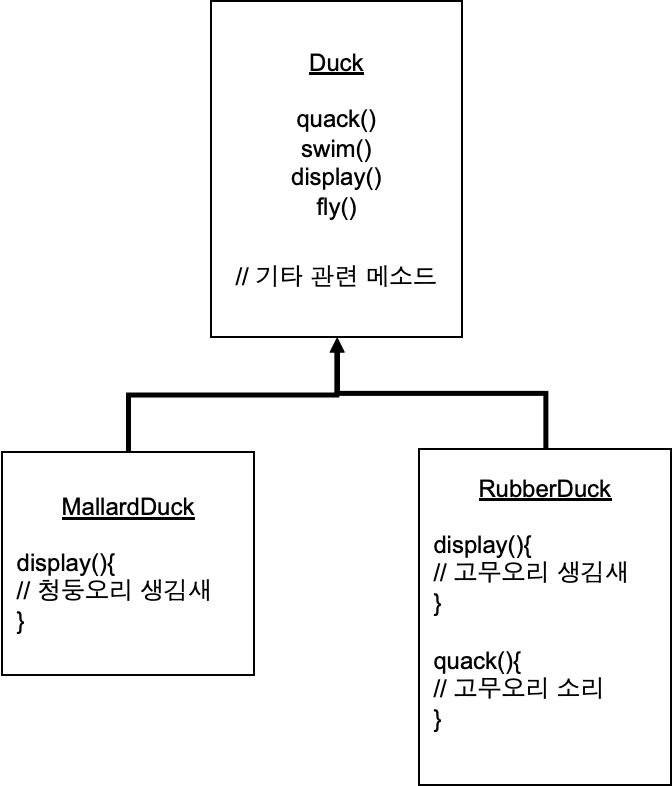 만약 상속을 이용해 청둥오리와 고무 오리를 구현한다면 다음과 같을 것이다. 청둥오리는 display메서드를 오버라이드 했고, 고무 오리는 display, quack메서드를 오버라이드 했다.