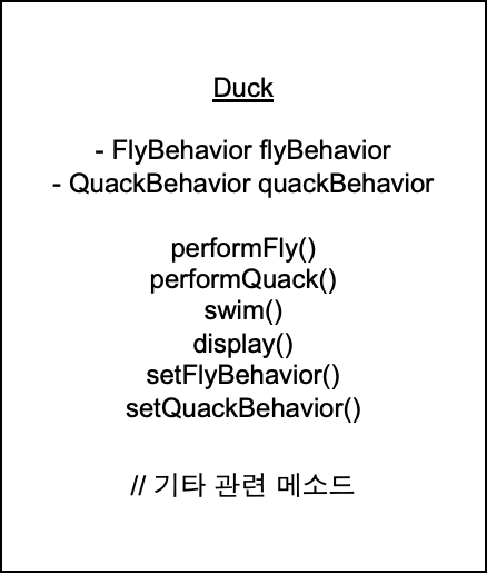 - (3) 오리 행동 형식을 동적으로 지정하기 위해 setter를 만들어준다. setter메서드를 포함해서 프로그램 실행 중에도 오리의 행동을 바꿀 수 있다.