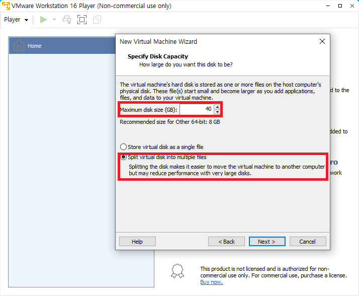 'Split virtual disk into multiple files' ์ต์ ์ ์ ํํฉ๋๋ค.