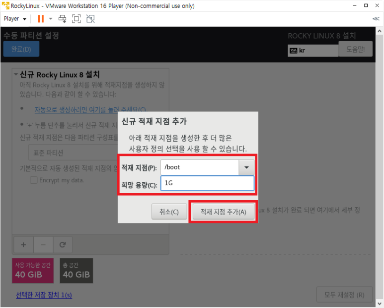 ์ ์ฌ ์ง์ ์ '/boot'๋ฅผ ์ ํ ํ ์ฉ๋์ 1GB๋ก ๋ง์ดํธ ์ง์ ์ถ๊ฐํฉ๋๋ค.