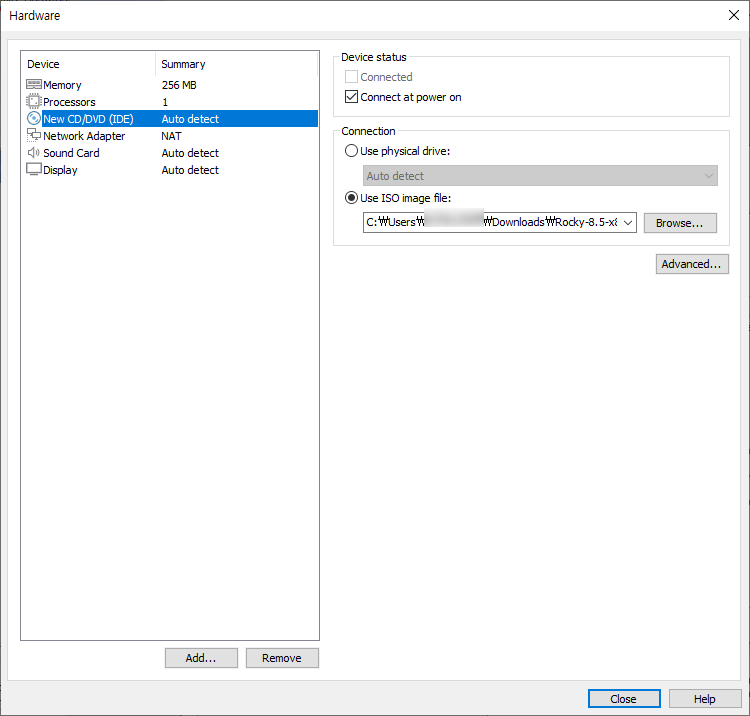 Use ISO image file ์ ์ ํ ํ, ์๊น ๋ค์ด๋ฐ์๋ Rocky Linux DVD ํ์ผ์ ๊ฒฝ๋ก๋ฅผ ์ง์ ํฉ๋๋ค