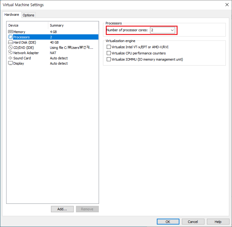Processors ํญ์์ ์ฝ์ด ์๋ 2๊ฐ๋ก ํ ๋นํฉ๋๋ค.