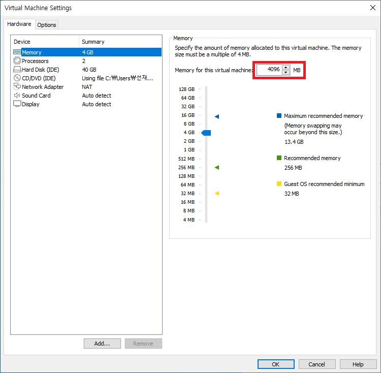 Memory ํญ์์ ๋ฉ๋ชจ๋ฆฌ ์ฉ๋์ 4GB๋ก ์ง์ ํฉ๋๋ค.