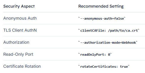 | 노드 (Node) | 단일 컴퓨트 호스트 | 노드 강화, kubelet 인증, 호스트 OS 패치 |