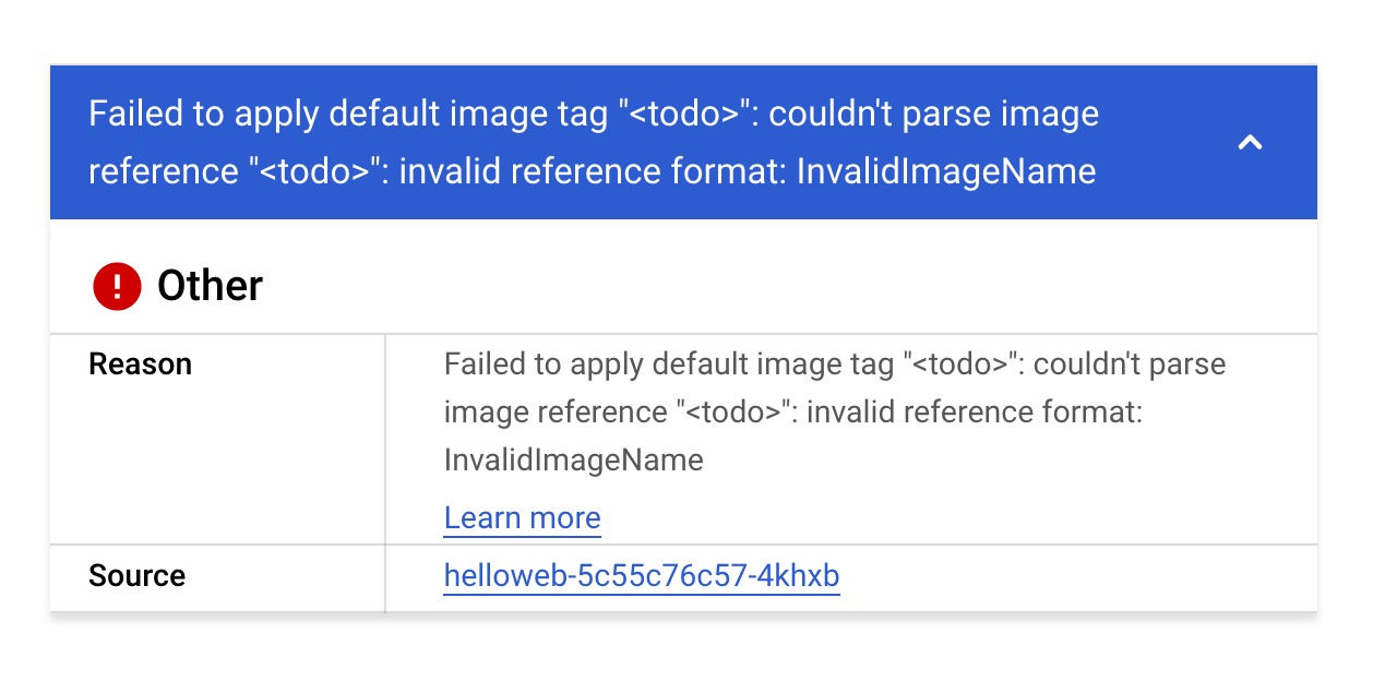 - Verify you have created the deployment, and navigate to the helloweb deployment details page. You should see the following error: