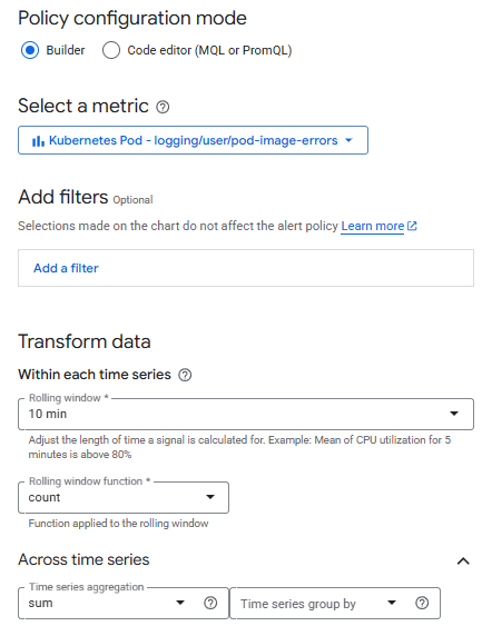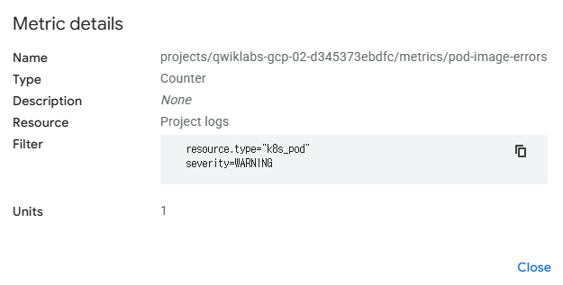 - Create a logs-based metric from this query. For Metric type, use Counter and for the Log Metric Name use pod-image-errors.